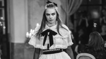Diesmal liess der Modeschöpfer dementsprechend historisch-österreichische Mode in seine Kollektion einfliessen. Diese setzte sich aus knöchellangen Lodenmänteln mit Brokatstickereien, Blusen mit Schmetterlingsprints, Lederhosen-Hotpants und Rollkragenpullovern sowie Stehkrägen mit Rüschendetails und natürlich zahlreichen Varianten der legendären Chanel-Jacke zusammen. Lederrock, Lederjacke und Blumenmuster Ein hübsches warmes Ensemble bestand aus einem wollenen Midi-Rock in Creme mit Perlendetails und einem passenden Cape, unter dem das Model einen Rollkragen-Pulli trug. Cara Delevingne trug eines der Highlights der Modenschau und begeisterte in einem weissen Kleid mit schwarzem Hüftband. /