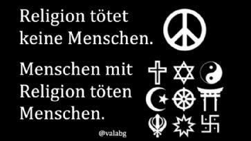 Religion tötet keine Menschen, Menschen mit Religion töten MenschenAnlässlich von Terrorakten und Gräueltaten vernehmen wir immer wieder mal ein «Das hat mit (wahrer) Religion nichts zu tun!» oder «Das sind keine Muslime, das hat mit dem Islam nichts zu tun!» Eine Aussage, die mich befremdet.Valentin Abgottspon / Quelle: news.ch / Donnerstag, 5. Februar 2015 / 10:17 h