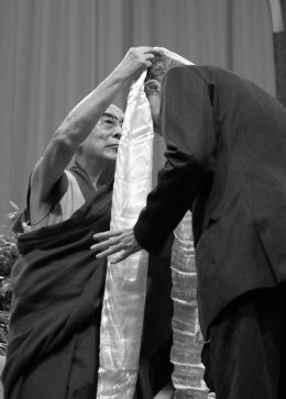 ![]() Der Dalai Lama legt dem Regierungspräsidenten Guy Morin die Khata, den traditionellen Begrüssungsschal der Tibeter, um. /