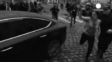 Eine der barbusigen Frauen kletterte sogar auf die Motorhaube der Limousine mit verdunkelten Scheiben, bevor sie von zunächst sichtbar überraschten Polizisten überwältigt werden konnte.