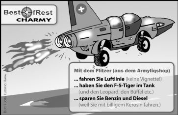 Autofahrer sollen blutenFür den Unterhalt der Schweizer Autobahnen greift der Bundesrat den Autofahrern bald noch tiefer in die Tasche. Falls Sie sich darüber ärgern, ist jetzt genau der richtige Moment auf eine billigere Alternative umzusteigen. Natürlich auf eine, die mindestens so viel (Fahr-)Spass macht, wie Ihr bisheriges Modell...Diana von Ow / Quelle: Nebelspalter / Mittwoch, 18. Februar 2015 / 16:19 h