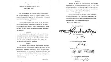 ![]() Die Rechte des Reichspräsidenten bleiben unberührt. A r t i k e l 3 A r t i k e l 4 A r t i k e l 5 Berlin, den 24. März 1933.