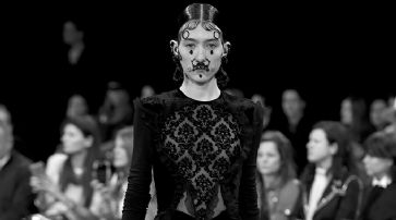 Der Blick fiel zunächst jedoch auf die stark mit Schmucksteinen, Piercings und Ohrringen maskenartig verzierten Gesichter der Models statt auf die Designs. Grosse Nasenringe und Schmucksteine Die erste Laufsteggrazie eröffnete die Modenschau in einem schwarzen, knielangen Samtkleid. Die Kreation wirkte recht bescheiden, auch wenn transparente Details im Brustbereich etwas Haut durchblitzen liessen. Auffälliger war der Gesichtsschmuck des Models: Neben zwei grossen Nasenringen verzierten silberne Schmucksteine ihre Wangen und schwarze Steine das Kinn und die Oberlippe. Die erste Laufsteggrazie eröffnete die Modenschau in einem schwarzen, knielangen Samtkleid. /