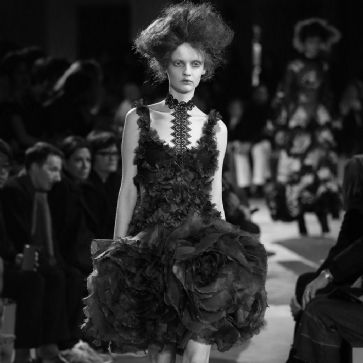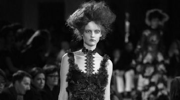 ![]() Für Dramatik sorgten riesige Rosen, Rüschen, Lack und raffinierte Stickereien, die die Kreationen zahlreich verzierten. Gleichzeitig verpasste Sarah Burton den historisch anmutenden Looks mit ihren viktorianischen Silhouetten einen modernen Touch und machte sie damit auch in der Gegenwart tragbar. Zu den dramatischen Highlights zählte ein kurzes, schwarzrotes Trägerkleid mit voluminösem Rock, das sich aus zahlreichen Rosenblüten zusammenzufügen schien. Dazu trug das Model schwarze Stiefeletten und ein Spitzenhalsband. Burton präsentierte viele kurze Kleider, die sich aus einem Mieder-artigen Oberteil und direkt anschliessendem Faltenrock oder einem voluminöseren Rüschenrock zusammensetzten. Ausserdem hatte sie zahlreiche lange Kleider im Angebot, einige davon aus Chiffon, andere mit Spitze und Rüschen verziert. Lack und Leder sorgten in weiteren Designs für eine Gothic-Atmosphäre. Laut 'Style.com' wollte die Alexander-McQueen-Designerin in ihrer Kollektion «die fragile Natur der Realität und die Schönheit der Unvollkommenheit» darstellen. Heute geht es in die finale Runde der Paris Fashion Week und Labels wie Louis Vuitton und Miu Miu stellen ihre Herbst/Winterkollektion 2015 zur Schau.