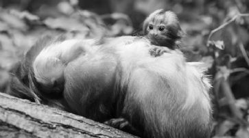 Familie der Krallenaffen Die Goldgelben Löwenäffchen gehören zur Familie der Krallenaffen. Von der Nasen- bis zur Schwanzspitze sind die erwachsenen Tiere rund 60 Zentimeter lang und sie wiegen rund 500 Gramm. Das ist eine gute Grösse, um sich in der dichten Vegetation fortzubewegen, wie Furrer sagte. Bei der Nahrungsbeschaffung sind die Krallen ein wichtiges Hilfsmittel.Ein junges Löwenäffchen versteckt sich hinter der Mutter. / Foto: Zoo Zürich