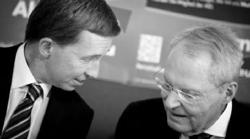 Henkel warnte in dem «FAZ»-Interview seine Partei vor dem Untergang, falls der Richtungsstreit nicht geklärt werde. «Dann wird die AfD scheitern. Das ist meine feste Überzeugung.» Zugleich versicherte er: «Ich werde mich weiterhin für die Partei einsetzen - aber nur dort, wo man sich an die Grundsätze unserer Partei hält.» Der 75-Jährige sitzt seit vergangenem Jahr für die AfD im Europaparlament. Henkel ist auch durch viele Auftritte in Talkshows bekannt. Die AfD liegt in den Umfragen derzeit deutschlandweit bei etwa sechs Prozent. AfD-Chef Bernd Lucke (l.) und der zurückgetretene Hans-Olaf Henkel. (Archivbild) /