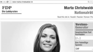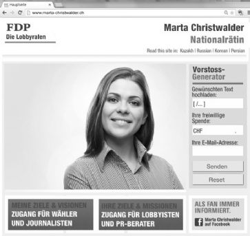 So sollte eine ehrliche Website aussehenDer Fall Markwalder zeigt: Vielen Wählern ist gar nicht bewusst, dass Parlamentarier nicht nur DAS VOLK vertreten, sondern mitunter auch ANDERE VÖLKER. Ein zeitgemässer Web-Auftritt schafft Abhilfe.Quelle: Nebelspalter / Donnerstag, 7. Mai 2015 / 21:16 h