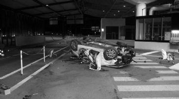 Das Auto landete schliesslich auf dem Dach liegend an der Mauer des Zollgebäudes. / Foto: Kapo JU