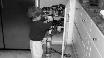 Quinn, ein 18 Monate alter Junge mit Autismus, besessen, Dosen zu stapeln. /