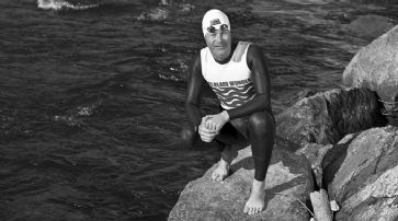 Gegenströmungen und Gegenwind verzögerten die Durchschwimmung des 60 Kilometer langen Lago Maggiore mit vier Seequerungen bei Tag und einer bei Nacht. Freitagnacht konnte er den Fluss Ticino in Angriff nehmen. Wegen Wassermangels musste er jedoch insgesamt 14 Kilometer zu Fuss zurücklegen. 2014 war Ernst Bromeis erst der zweite Mensch, der den Rhein von der Quelle bis zur Mündung durchschwamm. / Foto: Andrea Badrutt/Chur