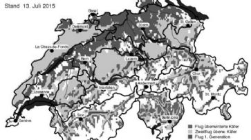 ![]() Ausschnitt aus der Startseite der Online-Borkenkäfer-Prognose. Die Karte zeigt, welche Generation in welcher Region der Schweiz den Flug begonnen hat. Auf weiteren Seiten gibt es detaillierte regionale Prognosen, Befallszahlen der letzten Jahrzehnte und allgemeine Informationen zum Buchdrucker. /