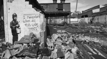 Das Bild zeigt einen kleinen schwarzen Jungen mit rotem Farbtopf, der anscheinend gerade «Ich weiss noch, wie hier überall Bäume standen» an die Mauer geschrieben hat. Banksy hatte das Bild 2010 auf die Aussenwand einer Industrieruine im darbenden Detroit gemalt.