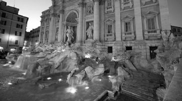 ![]() Der Brunnen bildet die Rückseite eines Palastes. Oben steht majestätisch die Figur des Meeresgottes Oceanus, darunter Rosse, Tritonen und Muscheln. Das Wasser umtost die Figuren und sammelt sich in einem grossen Becken. Woher der Trevi-Platz seinen Namen hat, ist nicht ganz sicher, womöglich von der Kreuzung dreier Strassen (italienisch: tre vie) in der Nähe. Die italienische Modegruppe Fendi sponserte die Renovierung mit zwei Millionen Euro.