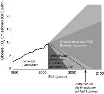![]() Entwicklung der Emissionen und Illustration des CO2-Budgets für das Zwei-Grad-Ziel. Die verschiedenen Farben zeigen Unsicherheiten. /