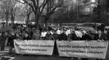 ![]() Nun aber wolle der Bundesrat im Budget 2016 und in den Folgejahren auf dem Buckel der Bauern sparen. Die Bauern waren am Vormittag aus allen Teilen der Schweiz nach Bern gereist, viele davon in Bussen, die in langen Reihen vom Aargauerstalden bis zum Guisanplatz parkiert wurden. Treicheln und Transparente Beim Bärengraben begann die Kundgebung. An der Spitze des langen Kundgebungszugs marschierten der Präsident des Bauernverbandes, Markus Ritter, und Verbandsdirektor Jacques Bourgeois. Mit Transparenten und Treicheln zogen die Landwirte unter ohrenbetäubendem Lärm gegen das Bundeshaus. Auf den Transparenten waren unter anderem Parolen zu lesen: "Wir brauchen eine verlässliche Politik" oder "heimische Nahrungsmittel für alle". Auf dem Bundesplatz wollten die Vertreter des Bauernverbandes im weiteren Verlauf der Kundgebung ein Forderungspapier an einen Vertreter des eidgenössischen Parlaments und an die Bundeskanzlei zu Handen des Bundesrats übergeben. Bis jetzt verlief die bewilligte Veranstaltung friedlich, da und dort kam es zu Verkehrsbehinderungen.