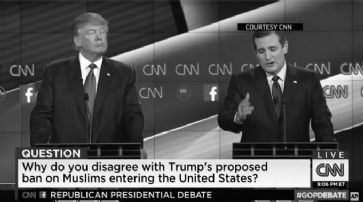 Hochburgen der IS-Miliz werde er mit einem «Bombenteppich» überziehen. Ausserdem verlangte er strengere Grenzkontrollen: «Wir werden keine Dschihadisten als Flüchtlinge akzeptieren.» Senator Marco Rubio forderte zusätzliche Kompetenzen für den Geheimdienst NSA bei der Überwachung der Telefon- und Internetkommunikation. Er erntete prompt Widerspruch von Rand Paul, der dem libertären Parteiflügel angehört. «Wir sind nicht sicherer durch die Sammlung der Daten von allen Amerikanern.» Trump verteidigt umstrittene Forderung Viel zu reden gab auch die umstrittene Forderung des Geschäftsmanns Donald Trump, Muslimen die Einreise in die USA zu verweigern. «Unser Land ist ausser Kontrolle», sagte Trump. Die aktuellen Topkandidaten Donald Trump und Ted Cruz. /