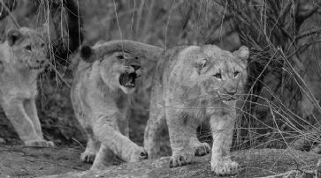 Die rund sieben Monate alten Löwen-Jungen im Zoo Basel sind in Hochform. Sie jagen sich gegenseitig herum, verfolgen ihre Mütter, kletterten im Gebüsch und fallen dort auch immer wieder herunter. Besonders interessiert beobachten sie, wenn eine Ente im Wassergraben landet. Manchmal tollen sie so wild herum, dass es sogar der aufpassenden Mutter zu anstrengend wird und sie die Jungen unsanft in die Schranken weist. Dies ist nichts Ungewöhnliches, denn auch die Jungen untereinander gehen zum Teil recht grob miteinander um. Da der Boden zurzeit nass ist, werden die Jungen beim Herumtollen eher unköniglich schmutzig. Der Vater verschläft die ganze Aufregung gerne auch mal. Manchmal liegt er eng zusammen mit den Jungen und einer Mutter herum, während eine Mutter Wache hält.
