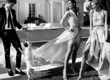 Eines der Fotos zeigt die drei Models vor der Kulisse eines luxuriösen Anwesens und einem Pool. Emilio trägt einen schwarzen Anzug, ein Jack-Russell-Terrier springt an seinem Bein hoch und scheint ihn ins Wasser stossen zu wollen. In der Mitte sieht man Lily in einem blassrosa Kleid, die ebenso lachend wie Kollegin Romee in Emilios Richtung blickt. Beide Damen zeigen ihre langen, sexy Beine, die von den Riemchen-High-Heels noch betont werden. Lilys Seidenkleid weist einen Kragen, halblange Ärmel und eine Knopfleiste auf. Lily Aldridge steht im Mittelpunkt einer neuen Carolina-Herrera-Kampagne. /