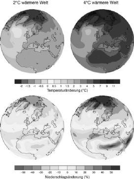 ![]() Änderungen von Temperatur und Niederschlag im Jahresmittel in einer zwei und einer vier Grad wärmeren Welt. /