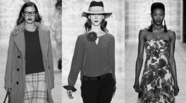 Marc Cain eröffnet die Show mit sehr maskulin geschnittenen, schwarzen Hosenanzügen. Untypisch für das sonst knallige Label. Zum weiten Anzug kombinieren die Designer XXL Kravatten, hohe Krägen oder Blusen mit grossen Schleifen um den Hals. Abgerundet wird der Look mit riesigen Blumenbroschen. Zusätzlich werden noch dunkle Pailettenröcke gezeigt, kombiniert mit Spitzenstrümpfen.