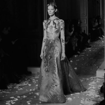Himmlischer Touch Die Falten kamen sehr subtil zum Einsatz und gaben den leichten Kleidern, die sanft auf den Boden fielen, einen himmlischen Touch. Diesen verstärkten auch die transparenten und leichten Stoffe sowie die goldenen Accessoires der Models. Auf ihren Köpfen trugen sie goldene, schlangenähnliche Schmuckstücke, die Haare fielen ihnen glatt über den Rücken. Die leicht taillierten, sonst aber locker fallenden Silhouetten der Kleider liessen die barfüssigen Models zum Teil wie griechische Göttinnen wirken. Viele der Designs waren mit goldenen Details verziert, Brokat kam ebenfalls reichlich zum Einsatz. Zu den Highlights der Haute-Couture-Kollektion aus dem Hause Valentino zählte ein märchenhaft grünes Kleid mit einem langen, weiten Rock und einem langärmeligen Oberteil, das teilweise transparent und reich bestickt war. Auch hier durfte natürlich die goldene Schlange als Kopfschmuck für das Model nicht fehlen.