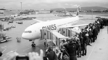 Neue Swiss-Boeing 777 in Zürich gelandetZürich Flughafen - Das neue Langstreckenflugzeug der Swiss ist am Freitagmorgen kurz nach 9 Uhr in Zürich gelandet. Die Boeing 777-300ER machte zuerst einen Tiefflug über die Piste 16/34 begleitet von zwei Kampfflugzeugen und landete nach einer Kurve auf dem Flughafen Zürich.bert / Quelle: sda / Freitag, 29. Januar 2016 / 10:40 h
