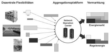 ![]() Das Prinzip von Demand Response: Flexibilitätsbausteine werden gebündelt und an Energiemärkten vermarktet. /