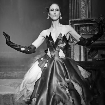 Jeremy schien ein Schloss überfallen zu haben und seine Models durch die Gänge eines längst vergessenen Glamours schreiten zu lassen. Die Damen flanierten über verblichene Teppiche mit orientalischem Muster und durch goldene Spiegelrahmen an kristallenen Gläsern und barocken Möbelstücken vorbei. Der Designer schien nicht nur mit der Kulisse, sondern auch mit seinen Kreationen den Verfall des Glamours zu dokumentieren.