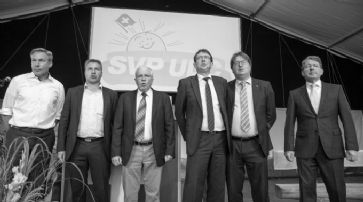 Beide hätten die Vorwürfe zurückgewiesen und ihre Verantwortung bestritten. Das Komitee habe mit «Bedauern und Traurigkeit» festgestellt, dass eine weitere Zusammenarbeit mit ihnen nicht möglich sei. Der Ausschluss aus der SVP Waadt und ihren Sektionen sei im 16-köpfigen Gremium fast einstimmig beschlossen worden. Für Voiblet, der massgeblich am Ausbau der SVP Waadt in den vergangenen Jahren beteiligt war, handelt es sich um einen weiteren Rückschlag in kurzer Zeit: Vor einigen Tagen wurde bekannt, dass die nationale SVP-Führung nicht mehr auf ihn als SVP-Vizepräsident zählt, im Herbst hatte er die Wahl in den Nationalrat verpasst. Claude-Alain Voiblet (2. von rechts) an der Delegiertenversammlung der SVP. /