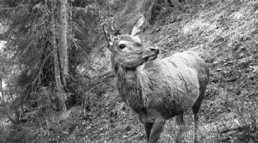 Ein ausgewachsener Hirsch ist deutlich grösser und fünfmal schwerer als ein Reh. Fotofallenaufnahme einer Hirschkuh. /