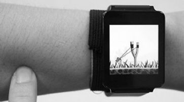 Freie Sicht dank Arm-Touch «Ein grosses Problem von Smartwatches und anderem digitalen Schmuck ist, dass die Bildschirme so klein sind», sagt Gierad Laput, Doktorand in der Future Interfaces Group der CMU. Das macht nicht nur präzise Eingaben schwer. «Der Finger blockiert viel vom Screen, wenn man ihn nutzt.» Auf einer Smartwatch sinnvoll arbeiten oder zocken ist daher nicht wirklich möglich - ausser mit neuen Tricks, wie eben SkinTrack. Denn damit verlagern Laput und seine Kollegen Eingaben auf den Unterarm und machen so die Sicht auf das Smartwatch-Display frei. «Das Tolle an SkinTrack ist, das es nicht auffällig ist; Uhren und Ringe sind Dinge, die Menschen ohnehin tragen», meint Yang Zhang, ebenfalls Doktorand in der Future Interfaces Group.Vogelschleudern geht dank Arm-Touch gut. /