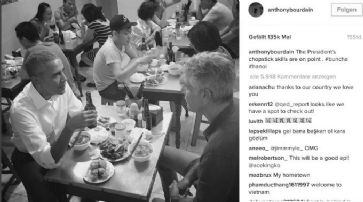 «Das Stäbchen-Können des Präsidenten ist bestens», schrieb Bourdain anschliessend auf Instagram. Er veröffentlichte ein Foto der beiden auf niedrigen blauen Plastikstühlen an einem Tisch voll Essen, Obama mit Bierflasche in der Hand. «Das Dinner hat sechs Dollar gekostet.