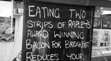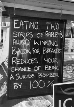 Auf der erst nach heftiger Kritik wieder entfernten Tafel war zu lesen «Essen Sie zwei Streifen des ausgezeichneten Specks von Rapleys zum Frühstück und reduzieren Sie damit Ihr Risiko, ein Selbstmordattentäter zu werden, um 100 Prozent».