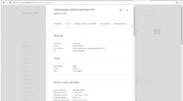 Technik Nützliche Infos zum Hosting-Anbieter, Hostingstandort, IP-Provider und die aktuelle IP des Servers. Zudem werden DNS- und Mailserver und das Land der Datenhaltung angegeben. Diese Angaben können von enormen Nutzen sein, wenn man nicht mehr richtig weiss, bei welchem Hostinganbieter man eine Website aufgesetzt hat oder wenn man auf der Suche nach den Verantwortlichen einer Website ist.Trust Eine experimentelle Relevanzberechnung, eine Trust-Einschätzung zur Domain und Angaben zur Verfügbarkeit von SSL-Zertifikaten. Diese Infos dienen zur schnellen und einfachen Risikoeinschätzung einer Domain.Archiv- und Live-Infos Sofern Daten gefunden wurden, wird angezeigt, wann eine Website zum ersten Mal im Netz gesehen wurde. Von wann stammt der älteste Cache einer Website, der neueste Cache, Live-Link raus zur Website, ein Link zum anonymen Besuch einer Website, der Traffic-Rank einer Domain und wenn verfügbar, historische Screenshots der Website aus dem Archiv. Bestehen noch keine Screenshots, können in der Regel auch Screenshots via screenshots.ch zur Aufnahme ins Archiv angefordert werden. Spannendes Feature: Wenn eine Domain frei ist, zeigt der Hitanalyzer trotzdem historische Infos an, falls die Domain früher schon einmal registriert und live war. Dies kann einem unter Umständen davor bewahren eine Domain zu registrieren die vorbelastet ist oder im Gegenteil, motivieren eine Domain zu registrieren, welche vorteilhafterweise schon Backlinks besitzt.Nutzerinfos Bei gewissen Domains existieren weitere Daten aus Firmenverzeichnissen.Hitanalyzer-Informationen für admin.ch: Hervorragende Werte bei Relevanz und Trust. Wen wunderts... /