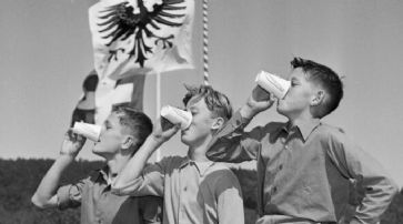 Anhand von 25 ausgewählten Episoden taucht die Ausstellung ein in die Kantonsgeschichte und liefert mit Pressefotografien aus dem Ringier Bildarchiv, Fotografien aus der Sammlung des Stadtmuseums Aarau und weiteren Archiven ein zeitgeschichtliches Panoptikum - ein Bilderkosmos der Moderne. Die Fotografien funktionieren als visuelle Zeitspeicher, die das konkrete Ereignis dokumentieren. Drei Ovo-trinkende Buben bei den eidgenössischen Kadettentagen, Aarau 11. September 1949. /