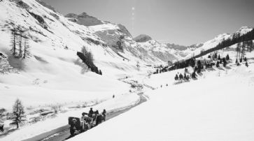 ![]() Das Hotel Fex (re. oben) im autofreien Fex-Tal ist nur zu Fuss, mit Kutsche oder Hotelbus erreichbar. /