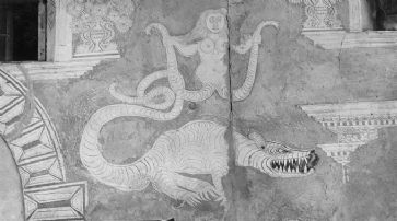 ![]() Die Melusinen-Sage entstand zu Beginn des 15. Jahrhunderts. Melusine, die sich jeweils samstags in ein schlangenähnliches Wesen verwandelt, heiratet Raymond von Poitiers unter einer Bedingung: Er darf sie am Samstag nie sehen. Er bricht das Tabu und Melusine entschwindet in Gestalt eines fliegenden Drachens. Sgraffito mit Drache und Melusine, Cinuos-chel (GR) /