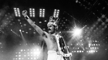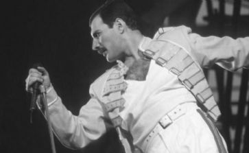 ![]() Freddie Mercury in seiner ikonischen gelben Jacke im Militärstil. /