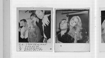 ![]() Ursula Rodel legt Alben mit ihren Erinnerungsfotos während verschiedener Dreharbeiten an. Die Seite zeigt Catherine Deneuve mit Schauspieler-Kollegen Gérard Depardieu, Jean-Louis Trintignant und Serge Gainsbourg während den Drehpausen zum Film «Je vous aime» (1980) von Claude Berri. Sofortbilder von 1977 bis 1980, beschriftet von Ursula Rodel. /
