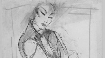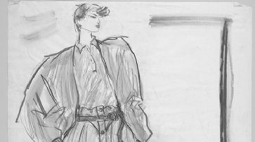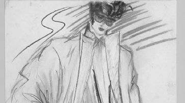 ![]() Das maskuline Frauenhemd ist von der Kleidung des Rockidols Elvis Presley inspiriert. Die Zeichnung gibt einen wilden, androgynen Look einer unabhängigen Frau wieder. Kollektionszeichnung von 1981. /