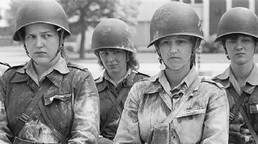 Für den «SonntagsBlick» und «Cash» realisierte Sabine Wunderlin unzählige Reportagen mit eindrucksvollen Bildserien und hielt Tagesaktualitäten fest. Von Kulturschaffenden bis hin zu Politiker:innen und A-Promis: Die Fotografin portraitierte über hundert bedeutende Persönlichkeiten. Aus der Reportage zum «Frauenhilfsdienst», Rekrutinnen nach einer Übung in Kloten, 1983. /
