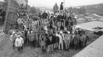 ![]() Die Arbeiter auf der Autobahnbaustelle der A3 bei Bözen, rund zehn Jahre bevor diese eröffnet wird, 1987. /