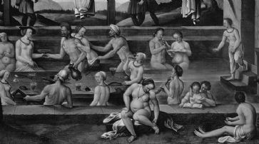 ![]() Im Heilbad vergnügen sich Jung und Alt und tauschen bei Speis, Trank und Musik Intimitäten aus. Wegen dem «Sittenzerfall» in den Bädern und der Verbreitung der Syphilis werden zu Beginn des 16. Jahrhunderts gemischte Badehäuser geschlossen. Bad zu Leuk (?), Hans Bock d.Ä., um 1597, Öl auf Leinwand /