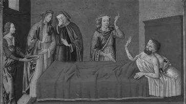 ![]() Dem Alten Testament zufolge verliert Hiob als reicher Mann alles und erkrankt an eiternden Geschwüren. Kraft seines Glaubens überlebte er die Krankheit. Er wird zum Sinnbild für die Überwindung von unverschuldetem Leiden durch Krankheiten. Hiob auf dem Krankenlager, Pseudo Bartolomeo di Giovanni, 1475-1500, Pappelholz /