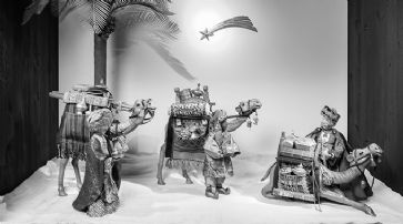 ![]() Kamele, Dromedare, Elefanten und Pferde als Tragetiere symbolisieren Reichtum, ferne Kulturen und die weite Reise der Könige. Die Heiligen Drei Könige mit Dromedaren, Hanny Roduner, Zürich, 2024 /